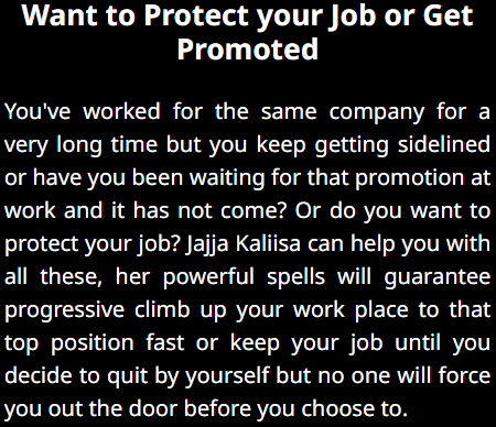 I was struggling to find a job for months until I sought JJAJJA KALISA's help. Her job promotion spell helped me secure a dream job with a higher position and better pay. My career has taken off, and I owe it all to JJAJJA KALISA s incredible magic!