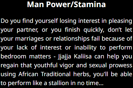 A Specialist African Witch Doctor with knowledge in the use of Black Magic, African Medicinal Herbs and Ritualistic Practices to help rid people of problems ranging from "Spiritual Protection", "Marrital Bond", "Love Spells" to "Persistant illnesses" and Many More Issues...